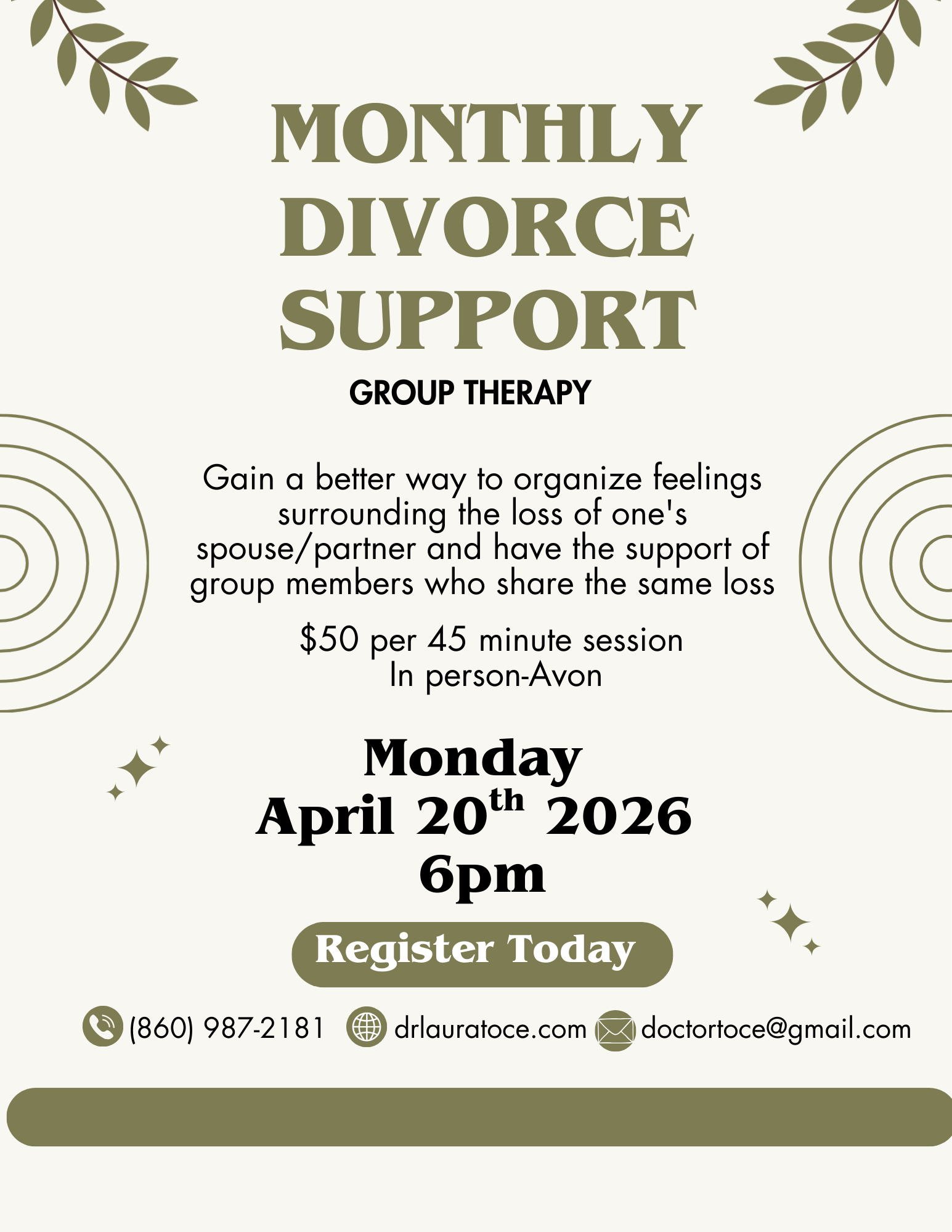 The monthly divorce group provides a framework for the feelings surrounding the loss of one's spouse/partner with a new topic of focus each month. Not only will you gain a better way to organize your feelings, you will also have the support of group members who share the same loss