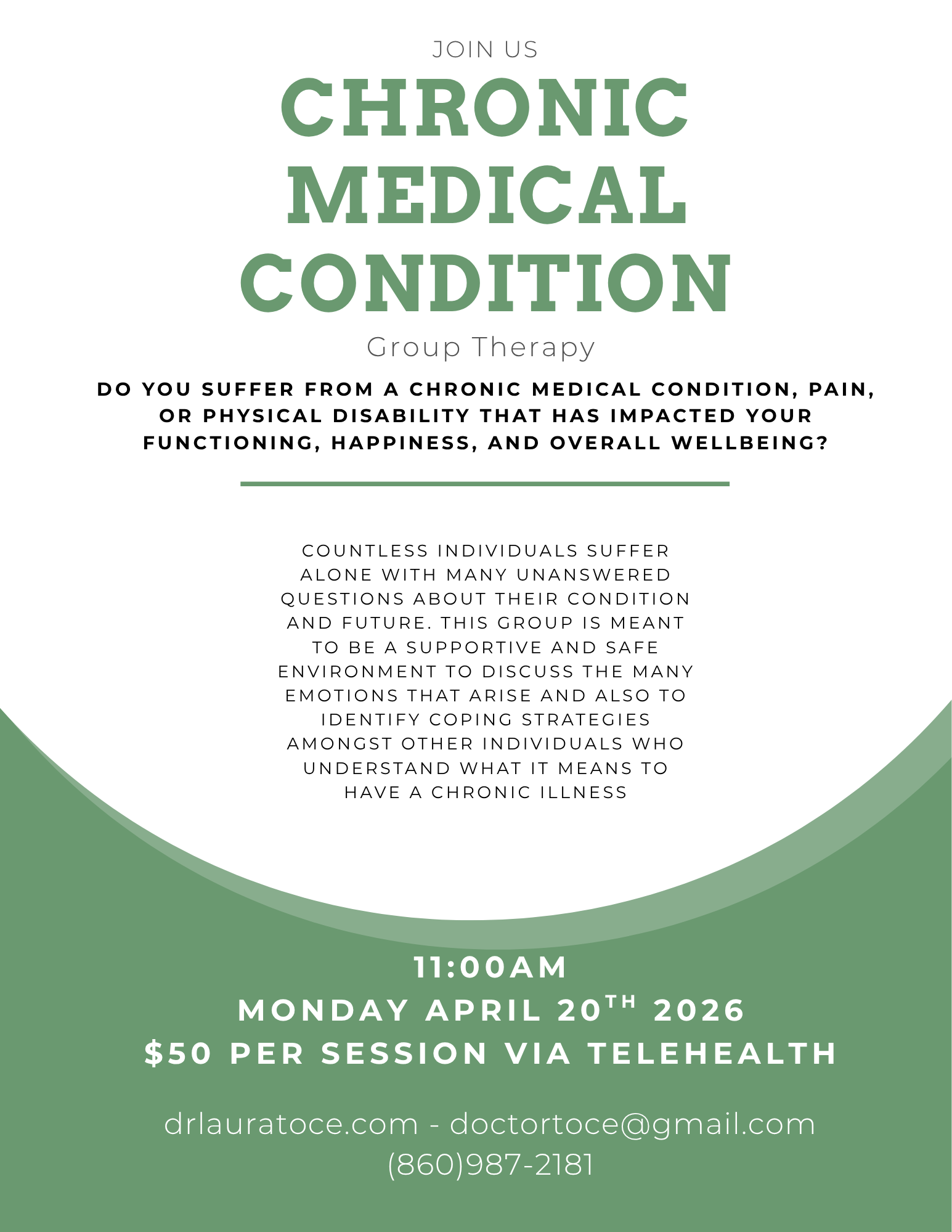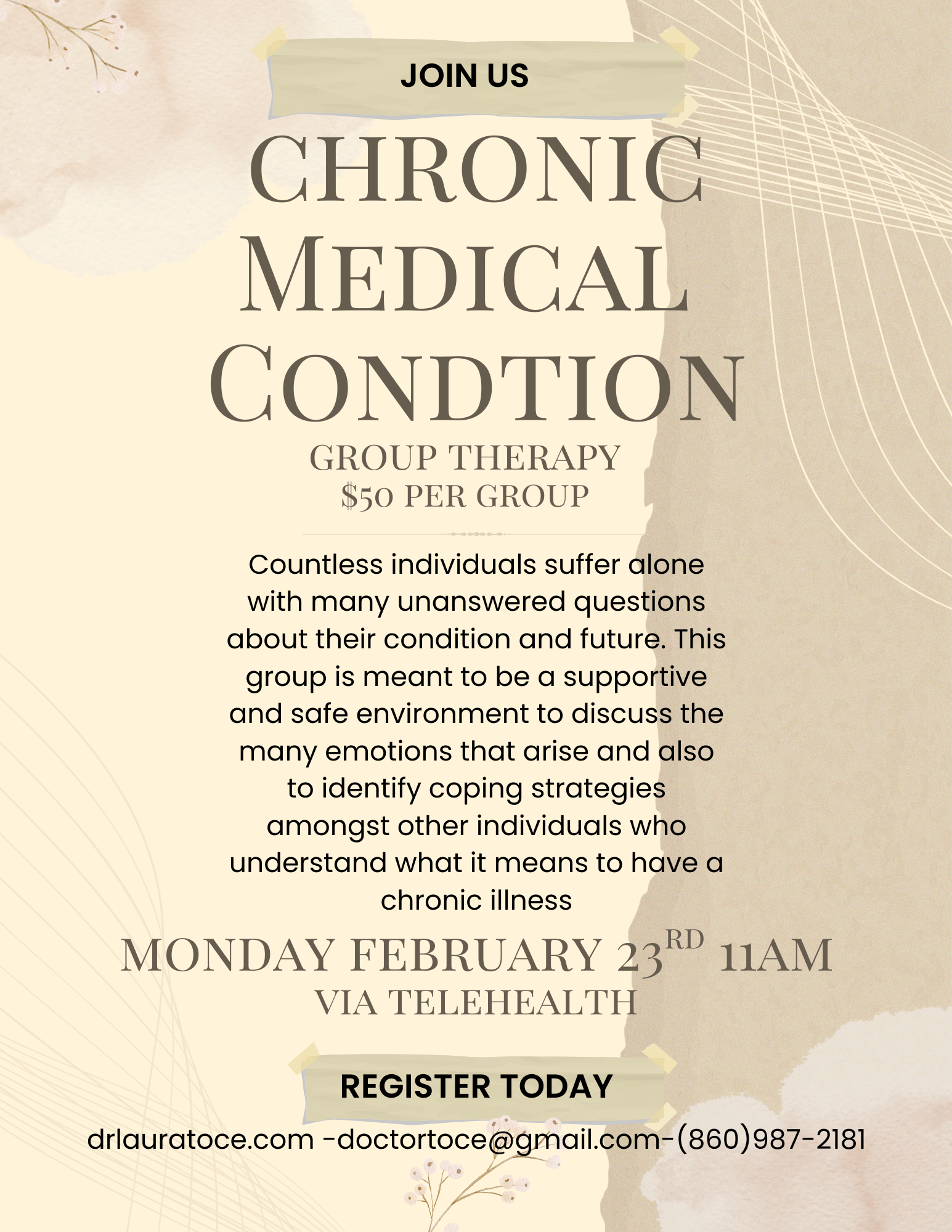 Do you suffer from a chronic medical condition, pain, or physical disability that has impacted your functioning, happiness, and overall wellbeing? Do you feel lost and alone? How do you cope? Countless of individuals suffer alone with many unanswered questions about their condition and future. This group is meant to be a supportive and safe environment to discuss the many emotions that arise and also to identify coping strategies amongst other individuals who understand what it means to have a chronic illness.